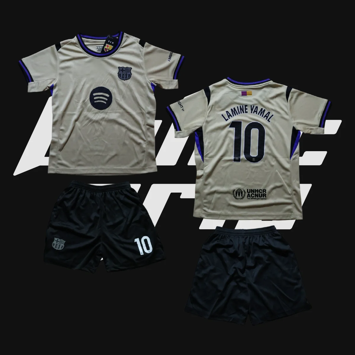 Aukštos kokybės futbolo apranga vaikams su Lamine Yamal vardu, 10 numeriu, smėlio marškinėliais ir juodais šortais. Puikiai tinka treniruotėms ir aktyviam laisvalaikiui.